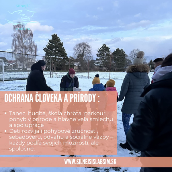 Program bol pestrý a plný energie – tanec, hudba, škola chrbta, parkour, pohyb v prírode, ale aj chvíle oddychu a spontánneho smiechu. Pohyb sa stal prirodzeným nástrojom spájania, spolupráce a odbúravania bariér. Deti mali možnosť rozvíjať svoje pohybové zručnosti, sebadôveru, odvahu a najmä sociálne väzby – každý podľa svojich možností, no všetci spoločne.