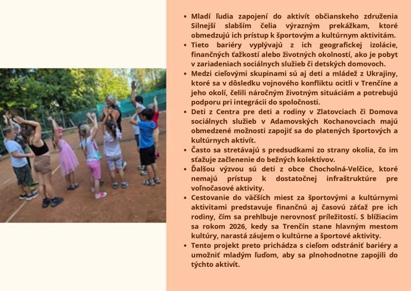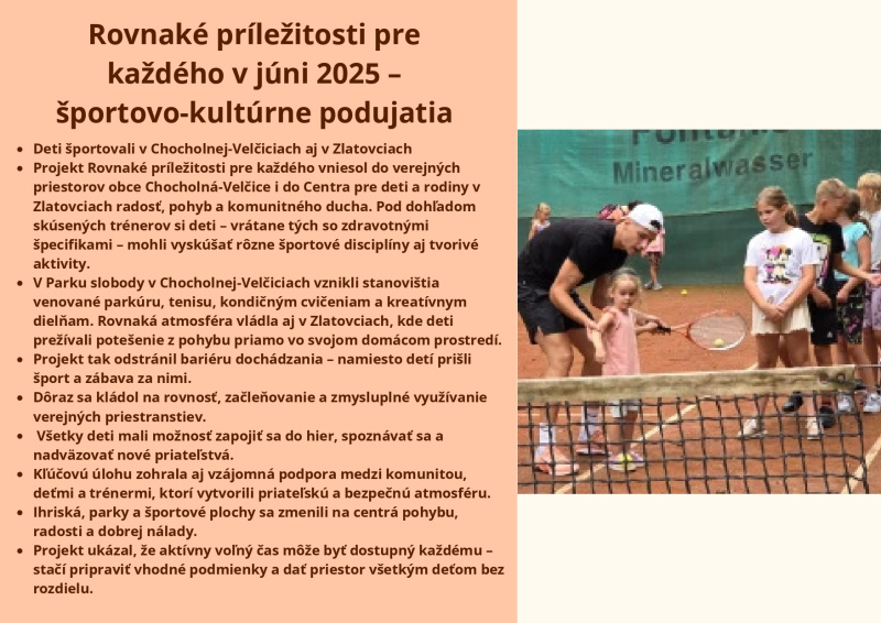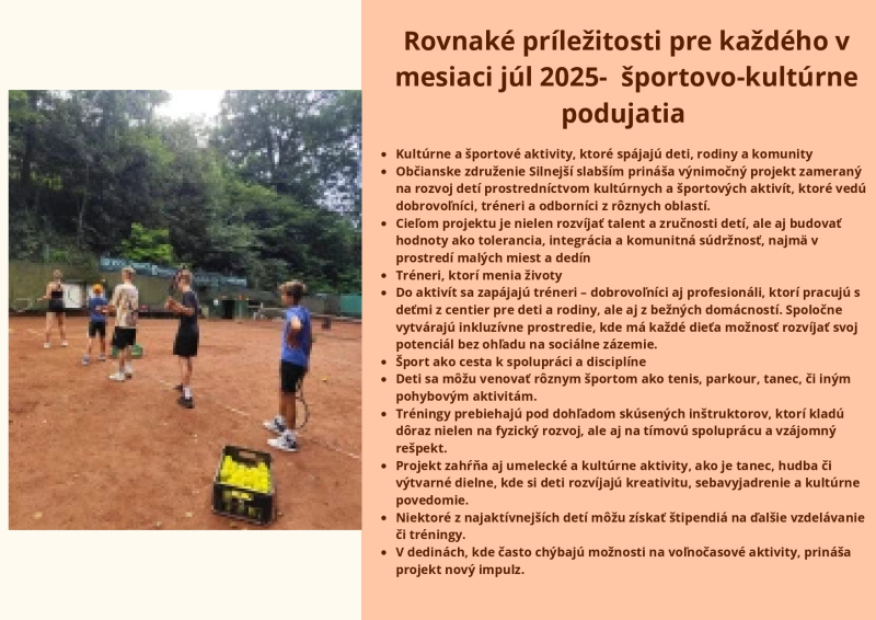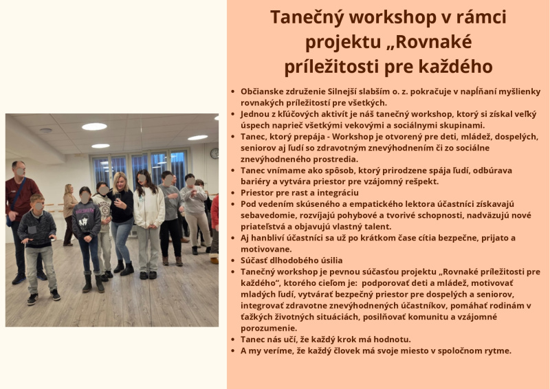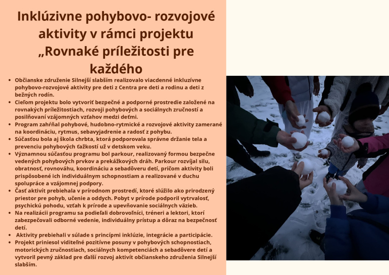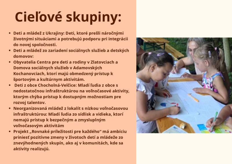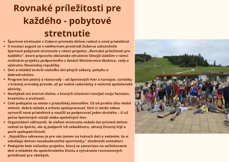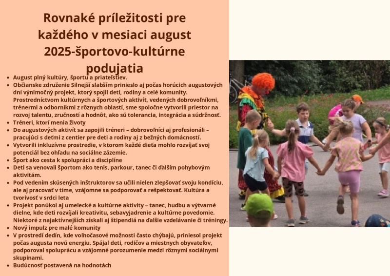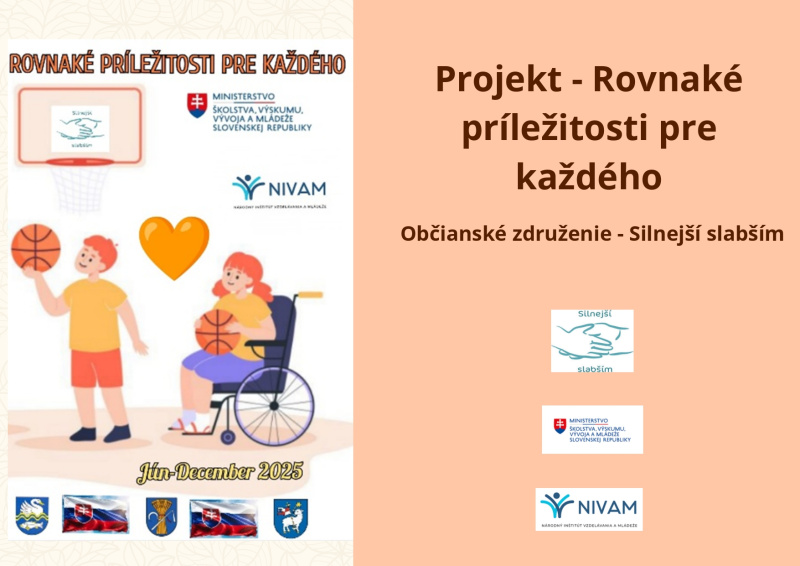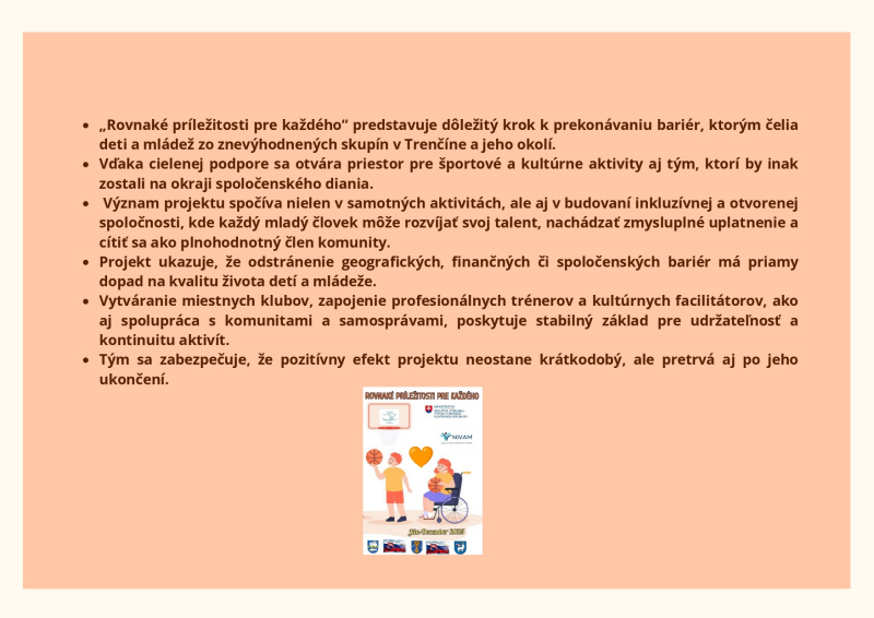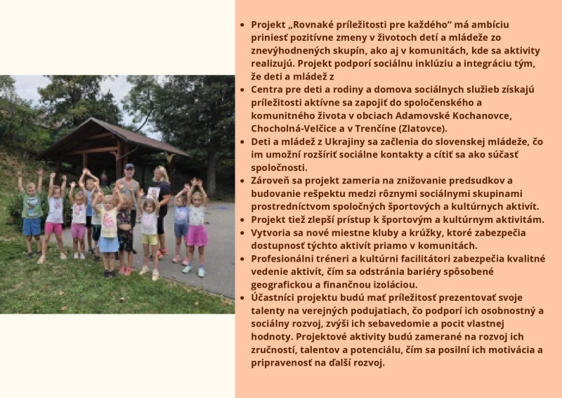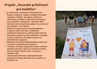 Brožúra Rovnaké príležitosti pre každého prináša zrozumiteľný a inšpiratívny pohľad na význam rovnosti, inklúzie a solidarity v spoločnosti. Poukazuje na dôležitosť podpory detí, mladých ľudí aj dospelých zo znevýhodneného prostredia a zdôrazňuje, že každý má právo na rozvoj svojho potenciálu bez ohľadu na pôvod, zdravotný stav či sociálne podmienky. Cieľom brožúry je zvyšovať povedomie, podporovať empatiu a motivovať jednotlivcov aj komunity k aktívnej pomoci a vytváraniu spravodlivého a otvoreného prostredia pre všetkých.