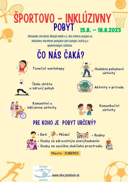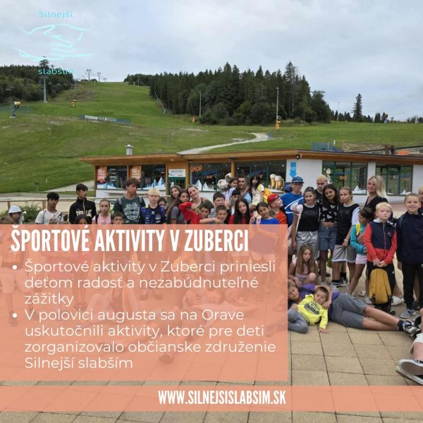 V mesiaci august sa v nádhernom prostredí Zuberca uskutočnilo športové pobytové stretnutie v rámci projektu „Rovnaké príležitosti pre každého“, ktoré pripravilo občianske združenie Silnejší slabším v rámci realizácie projektu podporeného z dotácii Ministerstva školstva, vedy a výskumu Slovenskej republiky. Deti a mládež strávili niekoľko dní plných zábavy, pohybu a dobrodružstiev. Program bol pestrý a rôznorodý – od športových hier a turnajov, turistiky v krásnej oravskej prírode, až po vodné radovánky a večerné spoločenské aktivity. Nechýbali ani tvorivé dielne, v ktorých účastníci rozvíjali svoju fantáziu, kreativitu a zručnosti. Celé podujatie sa nieslo v priateľskej atmosfére. Už od prvého dňa vládol smiech, dobrá nálada a ochota spolupracovať. Deti si medzi sebou vytvorili nové priateľstvá a naučili sa podporovať jeden druhého – či už počas športových súťaží alebo spoločných hier.